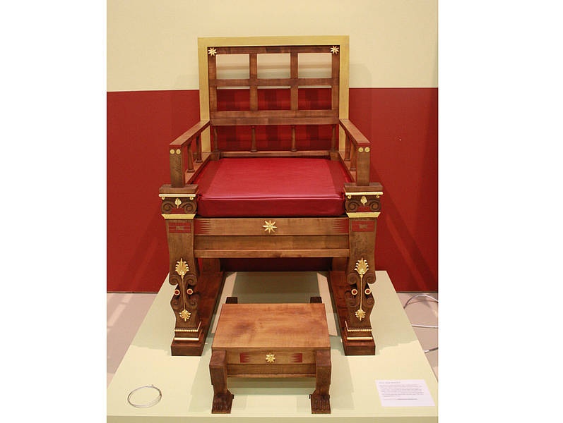 Das Exponat "Macedonischer Thron" gehört mit zur Ausstellung. Es handelt sich um eine Rekonstruktion nach archäologischen Funden. Der königliche Sitz war aus edlem Holz, verziert mit vergoldeten Ornamenten.