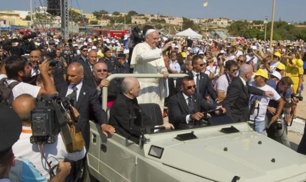 Papst Franziskus im Papa-Mobil bei den afrikanischen Bootsflüchtlingen. Mit dabei waren Inselbewohner und schaulustige Touristen. Skeptiker beklagten, dass die Show des Papstes" den betroffenen Hilfesuchenden in Wirklichkeit wenig brachte. Die Probleme der Schwarzafrikaner müssten in deren Herkunftsländern gelöst werden. Die Ablehnung von Wirtschaftsflüchtlingen in Europa steigt.