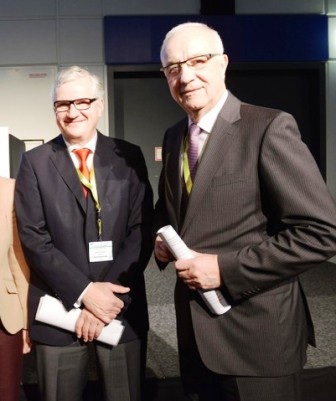 Zwei Pioniere der Kooperation gegen Krebs: DKG-Präsident , Prof. Wolff Schmiegel und Krebshilfe-Präsident Dr. Fritz Pleitgen. Sie und ihre Fachorganisationen haben die sinnvolle Zusammenarbeit auch beim Krebskongress in Berlin erfolgreich praktiziert. Von der Krankheit betroffene Menschen werteten in einer Befragung dieses Zusammenwirken bei Wahrung der Eigenständigkeit positiv.