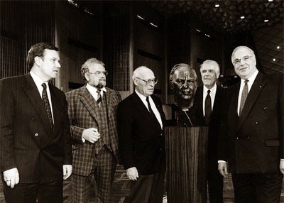German Chancellor Helmut Kohl (right) with the Minister of Defense Volker Rühe and sculptor Kurt Arentz (left) at the presentation of the portrait-bust Helmut Kohl". Also present on this occasion: representatives of the German business.