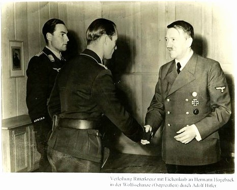 Geschwader-Kommodore Hermann Hogeback erhält aus der Hand Adolf Hitlers mehrfach hohe Auszeichnung für Tapferkeit. Das Foto wurde aufgenommen im Führerhauptquartier Wolfsschanze" in Ostpreußen. Das Territorium nach 1945 von den Siegermächten Polen überlassen.