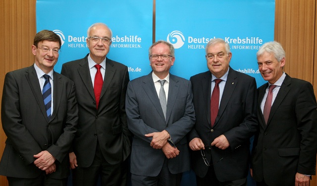 Die Fortführung des von Mildred Scheel geschaffenen Lebenswerkes der Krebsbekämpfung kann nur von Menschen mit gleicher Leistungsbereitschaft und starkem Gemeinsinn geleistet werden. Die Führung der Stiftung Deutsche Krebshilfe hat diese Fähigkeiten seit vielen erfolgreichen Jahren bewiesen. Das Bild zeigt die Führungsspitze bei einer Experten-Konferenz: Präsident Dr. Fritz Pleitgen (links mit roter Krawatte), Vorstandsvorsitzender Gerd Nettekoven (rechts) und Stiftungsrat-Vorsitzender Hans-Peter Krämer (zweiter von rechts).