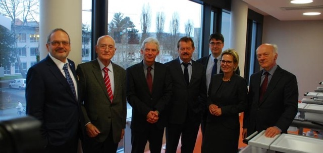 Gruppenbild mit Dame: Sachsens Sozialministerin Barbara Klepsch (CDU) mit Gerd Nettekoven von der Deutschen Krebshilfe sowie Wissenschaftlern und Professoren bei der Besichtigung der Neubauten im Universitäts Klinikum Dresden. Von links nach Rechts: Wilfried Winzer, Dr. Möhle, Gerd Nettekoven, Prof. Michael Albrecht, Prof. Michael Baumann, Staatsministerin Klepsch sowie Prof. Ehninger schauen sich im neuen Therapiebereich um.