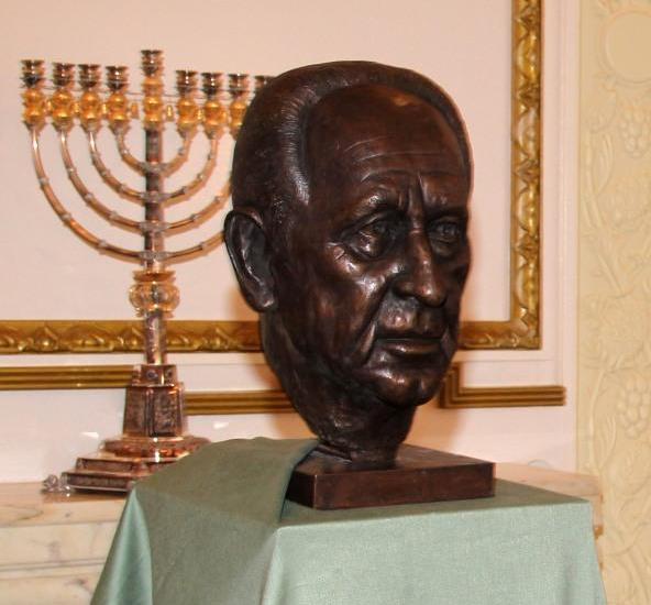 Die Büste Shimon Peres" von Kurt Arentz in der israelischen Botschaft in Berlin. Bei der Enthüllung war das Kunstwerk mit einer Menora wie auf einem Altar präsentiert. Der siebenarmige Leuchter ist eines der wichtigsten religiösen Symbole des Judentums und wurde bei der Staatsgründung Israels das Staatswappen aufgenommen.