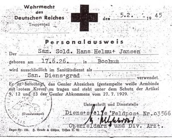 Ein historisches Dokument: Ausweiskopie: Wehrmacht des Deutschen Reiches. Personalausweis für Sanitäts-Soldat Hans Helmut Jansen. Ausgestellt am 5. Februar 1945 auf Schloss Nörvenich. Es wurde genutzt als Verbandsplatz für im Hürtgenwald kämpfende Wehrmachts-Angehörige.