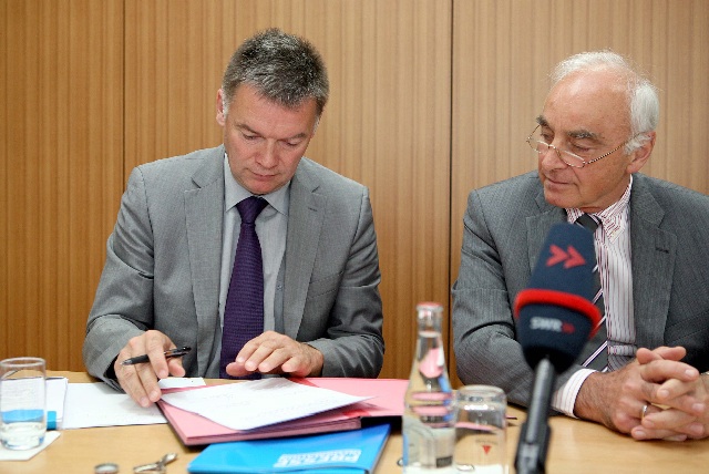 Für die Deutsche Krebsgesellschaft unterzeichneten DKG-Generalsekretär Dr. Johannes Bruns (links) und DKG-Präsident Prof. Werner Hohenberger die Kooperationsvereinbarung. Der Schulterschluss" im Kampf gegen den Krebs ist besiegelt.