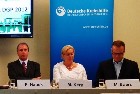 Internationale Pressekonferenz auf dem Palliativkongress in Berlin. Für die Deutsche Krebshilfe forderte Hauptgeschäftsführer Gerd Nettekoven (Bild Mitte) Aufwertung der Palliativmedizin durch die Gesundheitspolitik. Kongresspräsident Professor Dr. Christof Müller-Busch (links): Das Gesundheitswesen steht vor einer großen Herausforderung." DKH-Pressechefin Christiana Tschoepe (rechts): Engagement für umfassende und sachliche gesundheitliche Aufklärung.