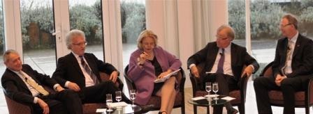 Die Diskussionsrunde auf dem Petersberg über die deutsch-französischen Beziehungen moderierte Dr. Hildegard Straußberg, die Diplomatische Korrespondentin Außenpolitik der WELT-Gruppe (Mitte). ihre kompetenten Gesprächspartner waren Yves Bur (Frankreich), Karl Lamers (früherer außenpolitischer Sprecher der CDU/CSU-Fraktion), Prof- Dr. Horst Teltschik (außen- und sicherheitspolitischer Experte, Berater von Bundeskanzler Helmut Kohl) sowie Axel Voss (Mitglied des Europäischen Parlaments.