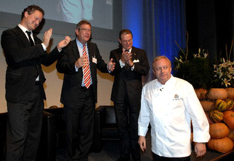 Vier erfolgreiche Männer: Florian Henckel von Donnersmarck (links) mit den Wirtschaftsbossen Arndt G. Kirchhoff und BDI-Chef Jürgen R. Thumann. Sie danken dem prominenten Koch Alfons Schuhbeck für seine Kochkünste. Dazu gehörte auch köstliche Suppe aus Kürbissen, wie sie (auf dem Foto) rechts zu sehen sind.