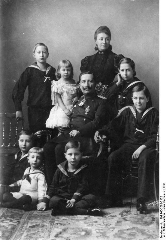Es War einmal: so beginnen die meisten Märchen. Das Foto zeigt die Kaiser-Familie, abgelichtet von Hofphotograph J. C. Schaarwächter, Berlin 1896. Auf dem Gruppenbild sind zu sehen von links nach rechts: Kronprinz Friedrich Wilhelm *6.5.1882 Kaiserin Augusta Victoria *22.10.1858 Prinzessin Victoria *18.9.1892 Prinz Adalbert *14.7.1884 Prinz August Wilhelm *29.1.1887 Kaiser Wilhelm *27.1.1859 Prinz Eitel Friedrich *7.7.1883 Prinz Joachim *17.12.1890 Prinz Oscar *27.7.1888.