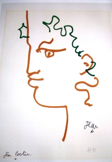Der junge Orpheus": Farblithographie von Jean Cocteau. Die repräsentative Lithographie wurde von Fernand Mourlot (Paris) auf französischem Arches-Papier abgezogen. Sie kann im Museums-Shop erworben werden. (E-Mail: schloss-noervenich@gmx.de) Es handelt sich um eine der schönsten Graphiken Cocteaus. Modell für das Bildnis war der junge Jean Marais.