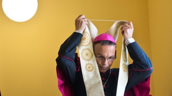 Der deutsche katholische Bischof Tebartz-van Elst in Limburg (am Fluss Lahn) wollte zu Ehre Gottes und für die Kirche bauen, ebenso wie zum Nutzen der Gläubigen. Er erntete dabei Missgunst aus den eigenen Reihen und Verleumdungen bei Papst Franziskus in Rom. Die entsprechende Strafe durch den Heiligen Vater" folgte auf dem Fuße. Unser Foto zeigt den Bischof guten Mutes vor dem Limburger Dom, als die Hetzkampagne gegen den Kirchenmann noch nicht gestartet war. Das historische Gotteshaus gilt heute als eine der vollendetsten Schöpfungen spätromanischer Baukunst. Der Dom ist auf dem deutschen 1.000-Euro-Schein abgebildet.