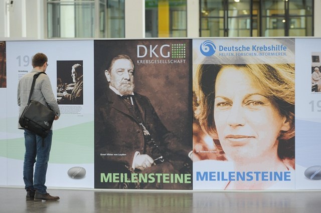 Das langfristige und zielorientierte Eintreten von Organisationen gegen Krankheiten hat in Deutschland eine gute Tradition. Dies brachten auch die Kongress-Veranstalter auf informativen Plakaten zum Ausdruck mit Hinweisen auf ihre Wurzeln: links das Plakat der Krebsgesellschaft und Rechts der Poster mit dem Foto der Ärztin Dr. Mildred Scheel.