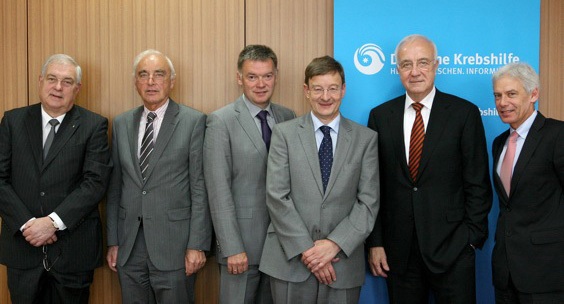 Gruppenbild der Macher" am 2. Juli 2012 in Berlin bei der Unterzeichnung des Kooperationsvertrages. Der Vorstandsvorsitzende der Deutschen Krebshilfe, Hans-Peter Krämer (links) stellt sich mit dem Präsidenten der Deutschen Krebsgesellschaft Prof. Dr. Werner Hohenberger und weiteren Führungspersönlichkeiten beider Organisationen zum Gruppenfoto. Mit dabei an diesem historischen Tag DKG-Generalsekretär Dr. Johannes Bruns (Dritter von links). Daneben stehen Krebshilfe-Vorstandsmitglied Prof. Dr. Otmar Wiestler und Gerd Nettekoven (rechts), Hauptgeschäftsführer der Deutschen Krebshilfe. For our article in German, see Deutsche Krebshilfe und Krebsgesellschaft: Kooperation für die Menschen ...