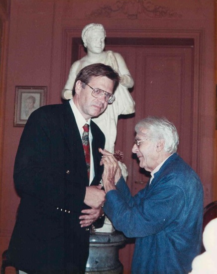 Honor in the " Violet Salon" of the Grandmaster: Roger Peyrefitte presents to the OAG Chancellor Consul B. John Zavrel the Order's pin in the colors Gold-Red-Blue-Gold. The walls of the sacred room in the residence had been painted violet, so that the antique figures can be displayed at their best. For our article, see Roger Peyrefitte zum 105. Geburtstag ...