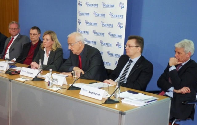 Start der Langzeitstudie zur Therapie von Prostata-Krebs in Berlin. Dr. Fritz Pleitgen, Präsident der Deutschen Krebshilfe, stellt das bisher einmalige Forschungsprojekt in der Hauptstadt vor. Er dankte allen Mitwirkenden an der Studie, die von den Wissenschaftlern Professor Dr. Michael Stöckle und Professor Dr Thomas Wiegel. geleitete wird. Das Foto zeigt Teilnehmer der Pressekonferenz mit Krebshilfe-Präsident Dr. Pleitgen (Mitte), Pressesprecherin Christiana Tschoepe (links) und den Hauptgeschäftsführer der Deutschen Krebshilfe, Gerd Nettekoven (rechts außen). For our article, see Prostata-Krebs: Die große Angst des Mannes ...